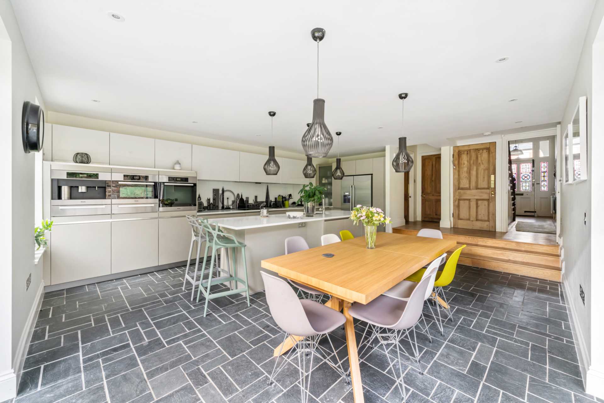 On the ground floor are three reception rooms, all with period fireplaces, and one with French doors leading to the large rear garden. The south west facing mature garden is mainly laid to lawn, with shrubs in the borders and a side passage leading via a gate to the front of the house. From the open plan kitchen/family room corner bi-fold doors open onto a patio seating area and garden. Next to the kitchen, there is a utility/laundry room, with side access, a good size cellar and separate WC.